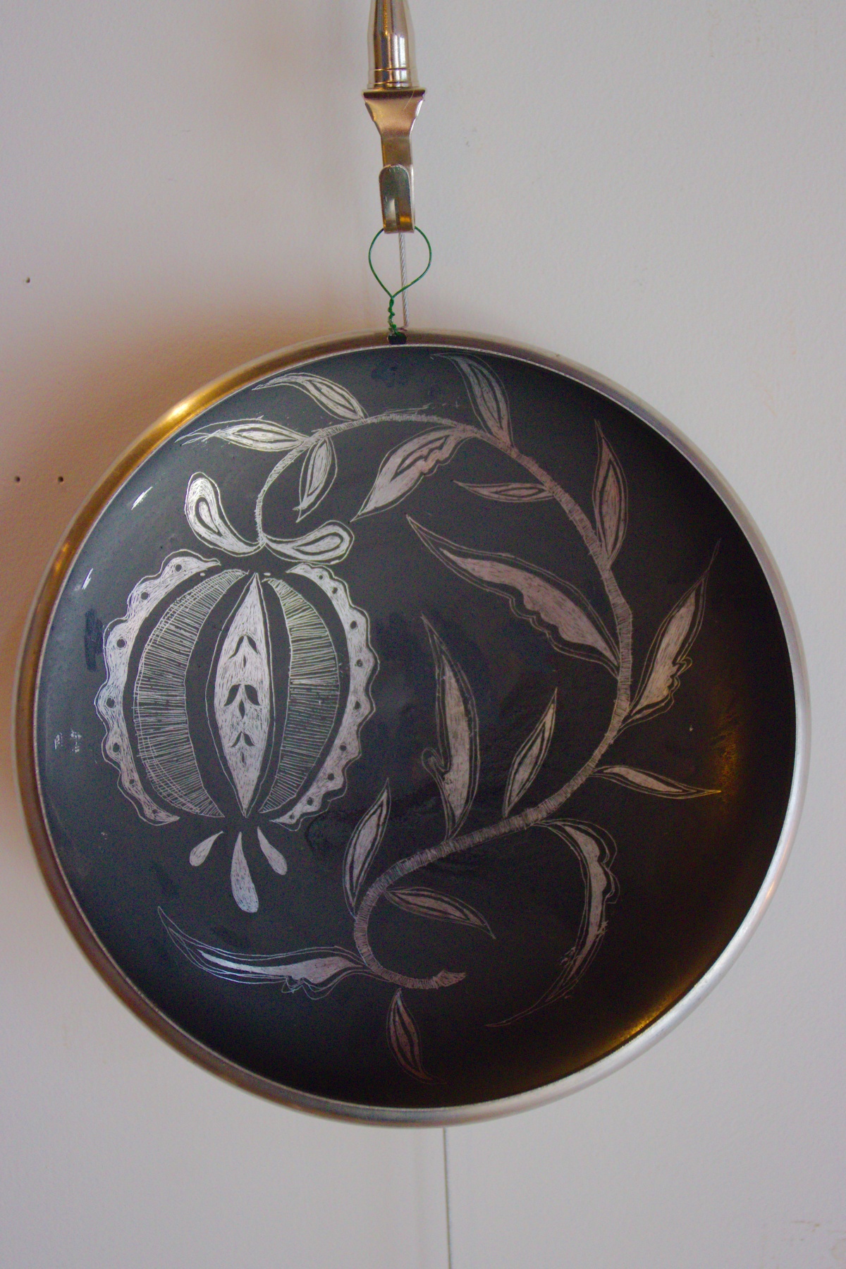 On the end wall, where the stairs to the loft run, Dorothy had some artwork hanging. She also had a few things on a table. There was reasonable traffic through the shop during the evening and I believe Dorothy sold a few pieces. This is one that I particularly liked, of a stylized pomegranate. We were happy to also have our good friends Maureen and Bob come up and then we all went down the block to Famous Hot Weiner for dinner. I can’t say the hotdog was anything special, although I did enjoy the old-timey atmosphere.